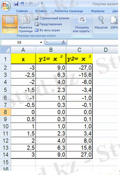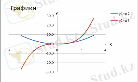 0, 5 қадаммен [- 3 ; 3] аралығындағы y1= x 2 и y2= x 3 функцияның графигін тұрғызу