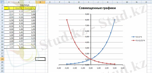 Функция y1= 2^x и y2= (1/2) ^х, аралық [- 3 ; 3] , қадам 0, 5.
