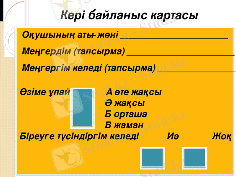 - кері байланыс картасымен таныстыру, сабақ соңында толтыру керектігі ескертіледі.