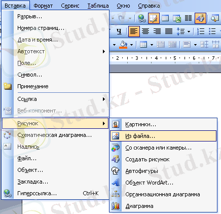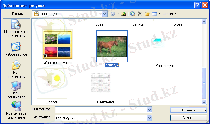 - Вставка-Рисунок-Из файла (Қою-Сурет-файлдан) командаларын таңдау;