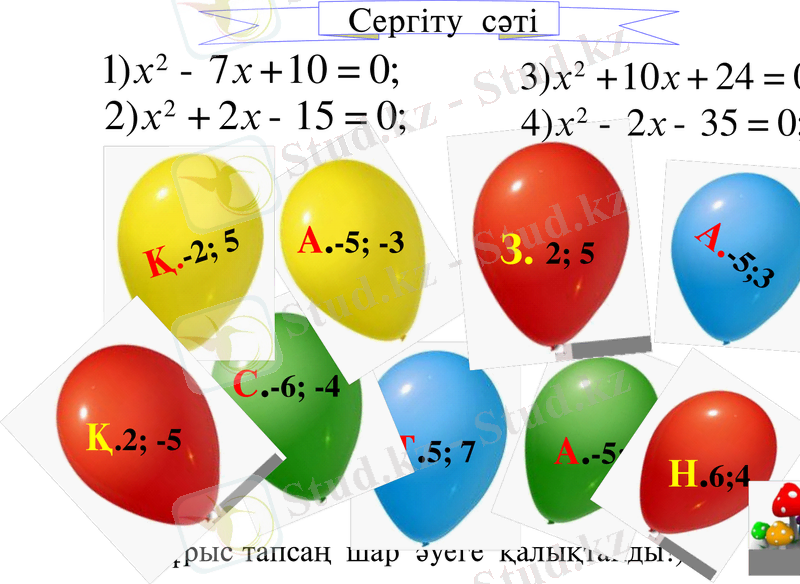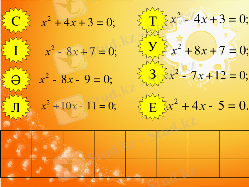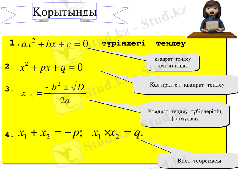 Сабақтың мақсаты : 1) Виет теоремасын айта алу және есеп шығарғанда қолдана білу дағдыларын дамыту.