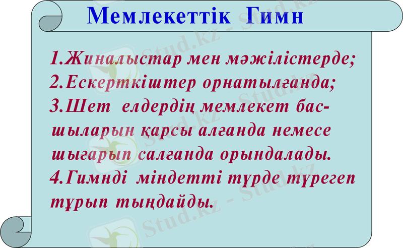 - Көгілдір аспан түстес - туымыз бар, айбынды - елтаңбамыз және мағыналы - әнұранымыз бар.