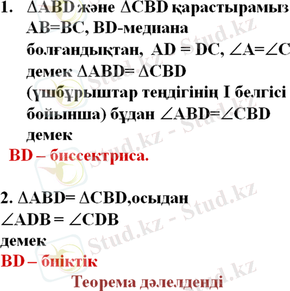 3) 1 - теорема. Тең бүйірлі үшбұрыштың табанындағы бұрыштары тең.