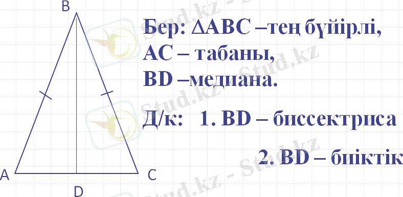 Тең бүйірлі үшбұрыштың табанына жүргізілген медиана осы үшбұрыштың әрі биссектрисасы, әрі биіктігі болады