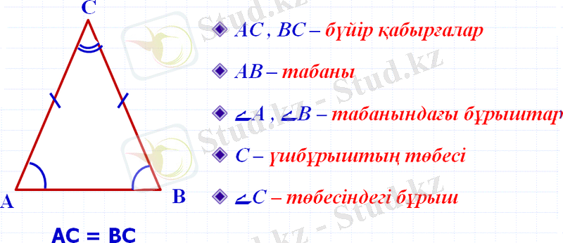1) Екі қабырғасы өзара тең үшбұрыш тең бүйірлі үшбұрыш деп аталады