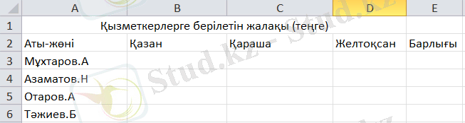 3. А1 ұяшығына кестенің «Қызметкерлерге берілетін жалақы (теңге) тақырыбын енгізіңіз.