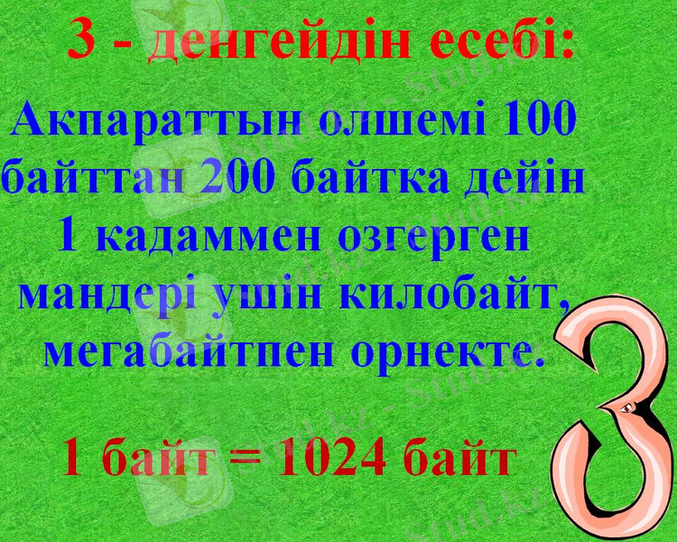 3 - деңгейдің тапсырмасы . Ақпараттық өлшемі 100 байттан 200 байтқа дейін 1 қадаммен өзгерген мәндері үшін килобайт, мегабайтпен өрнекте.