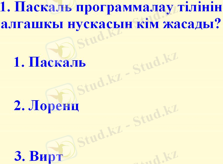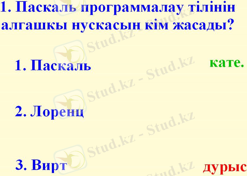 - Pascal программалау тілі бойынша 20 сұрақтан тұратын тестті activboard - тің көмегімен орындау. Оқушылар тесттің нәтижесін барлық сұраққа жауап беріп болған соң көреді. (15 мин)