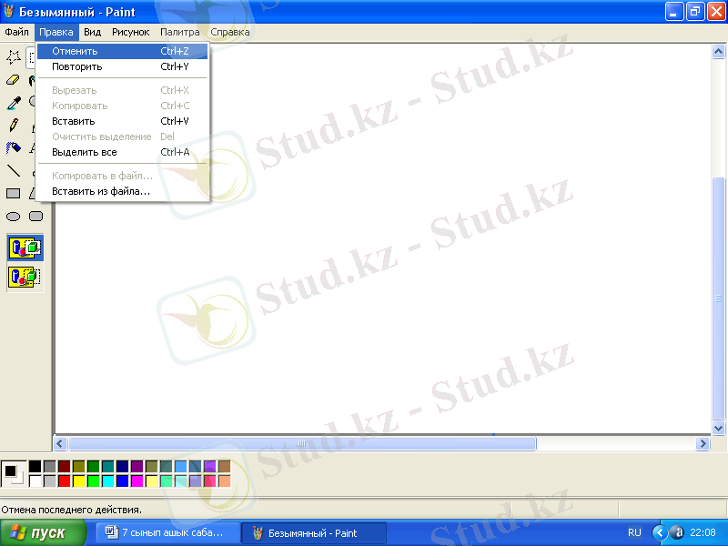 Егер бір жұмыстарын ойдағыдай болмас, абыржымаңдар. Соңғы үш әрекетті әрқашан орындамауларына болады, ол үшін Орындатпау (Отменить) командасын пайдалану. Правка - Отменить командасын орындау арқылы соңғы үш әрекетті болдырмауға болады.
