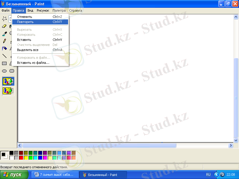 Егер сендер бір әрекетті қателесіп алып тастасаңдар немесе алдыңғы әрекетті қайталау қажет болса, онда оны Правка - Повторить командасын орындап, алып тастаған әрекеттерді қайталауға болады. Осы әрекетті үш рет қатар жасауға болады.