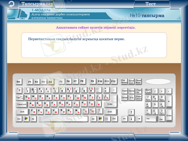 - Меңзерді басқару пернелері. Меңзер дегеніміз-экранда жыпылықтап тұратын символ. Бұл пернелер меңзерді экранда жылжытуға арналған.