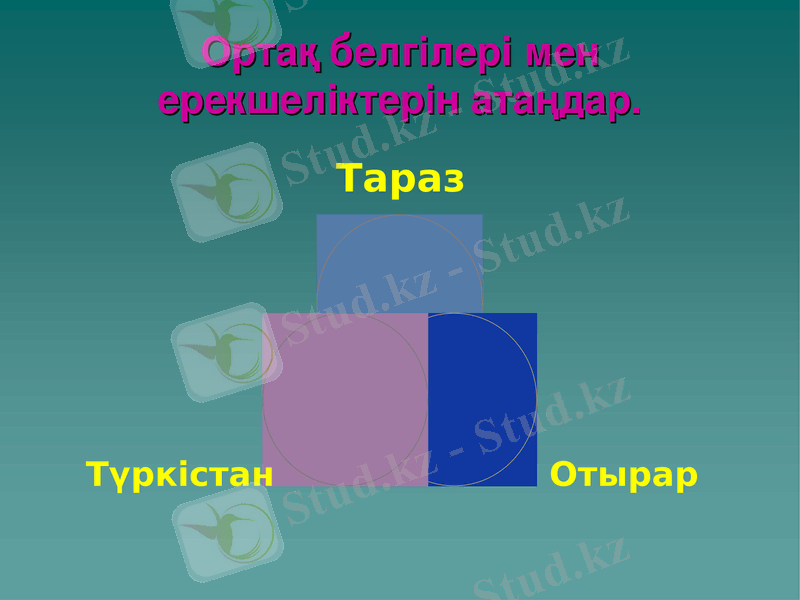 IV. Сабақты қорытындылау кезеңі: Венн диаграммасы бойынша үш қаланың ортақ белгілері мен ерекшеліктерін айту, «Ежелгі Қазақстан» кітабы туралы қысқаша баяндап, сабақ бойынша қорытынды сөз айту, бағалау.
