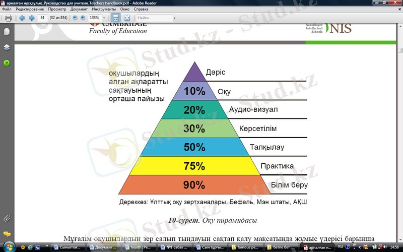 2. Өз ойын айту әдісі оқушылардың ойлану, ойлауы арқылы ауызша жүйелі айтып беруге дағдыландыру. Бұл жерде мен Джиксо әдісін қолдандым. Әр топтан бір лидер екінші топқа барып, өз түсінгенін айтып береді, және топтағы оқушылармен талқылайды. Осы Джиксо тәсілі арқылы менім түйгенім Айгерім, Арухан, Айжан өздерін мұғалім ретінде сезініп, ал сабақта әрдайым алаңғасарлық танытып жүрген Алшын, Алмат сол қыздардың айтқанына таң қалып, қол шапалақтаған сәттері болды. Содан түйгенім мұғалім айтушы, түсіндіруші емес, бағыттаушы деген қағиданы сөз жүзінде емес, өзімнің ісімнен анық көргенімді жасыра алмаймын. Оқу пирамидасы бойынша Бефельдың дерек көзіне сұйне отырып, оқушылардың диалогтық оқыту бойынша бірін бірі оқыту арқылы оқушылардың алған ақпаратты сақтауы 90% құрайтынына көзім жетті.