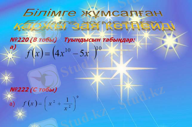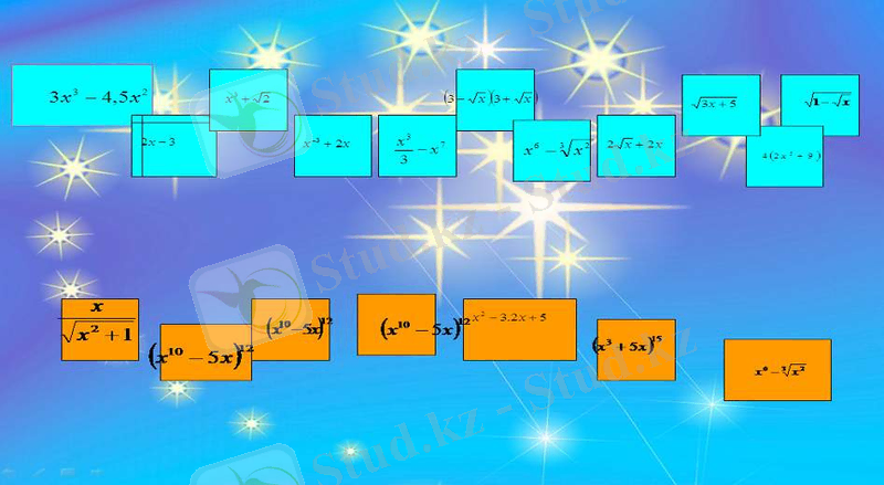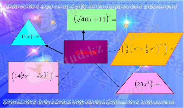 б) туынды ережелерін, туынды есептеу тиісформулаларын, күрделі функцияның туындысын білуі тиіс