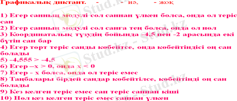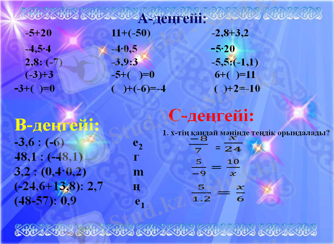 А/ -20; В/ 0, 4; С/ -7, 4 Д/ -2Жауаптары интерактивті тақтада біртіндеп ашу арқылы тексеріледі.