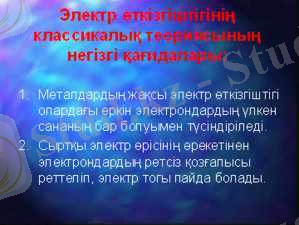 Ғылым мен техниканың, өндіріс технологиясының қарқынды дамуы, экономиканы көтерудің күрделі мәселелерін шешу кезеңінде мектептегі оқыту оқушыларды белгілі бір білім қорымен қаруландырумен шектелмеуі тиіс. Олар алған білімдерін өз беттерімен әрі қарай кеңейтіп, тереңдетіп әртүрлі жаңа жағдайларға қолдана алатындай жоғарғы деңгейдегі ойлау қызметін дамытуға қол жеткізу керек. Осындай жаңа жағдай 10 «А» сынып оқушыларының «Әр түрлі ортадағы электр тогы» тарауын қорғауда презентацияны қолдануы. Тараудағы өз тақырыптарын ашу үшін оқушылар компьютер мүмкіндіктерін, интернет жүйесін пайдаланып жұмыстарын қорғай алды.