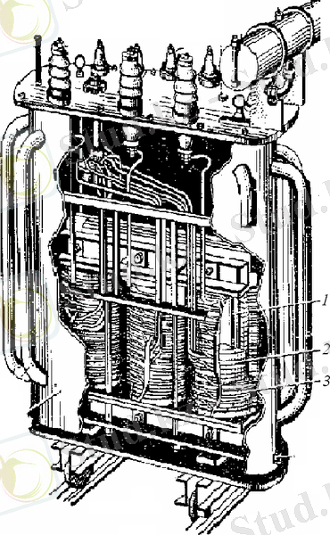 1. -сурет. Өзекшелері бір жазықтықта орналасқан үшфазалы үшөзекшелі кернеу трансформаторы: 1 - магнитөткізгіш; 2 - төменгі кернеу орамасы; 3 - жоғарғы кернеу орамасы.
