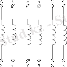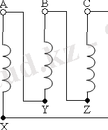 2. Үшфазалы трансформаторлар орамдарының белгіленуі және жалғану топтары. Жоғары кернеудің фазалық орамаларының басы латынша бас әріппен А, В, С, ал аяғы жағынан, Y, X Z пен белгілейді. Төменгі кернеулі орамның қысқыштарын латын алфавитінің кіші әріптерімен белгілейді; а, в, с-ораманың басы және x, y, z-ораманың аяғы (3-сурет) . Қысқа болу үшін, фазалық орамаларды бастапқы әріптерімен белгілейді Фаза А(а), фаза В(в), фаза С(с), бір фазалық ораманың басы мен аяғы еркін етіп таңдайды. Онда ораманың қалған екі ораманың басы етіп қысқыштарды алады, содан шығып орамаға орау бірінші ораманың бағытымен жүргізіледі.