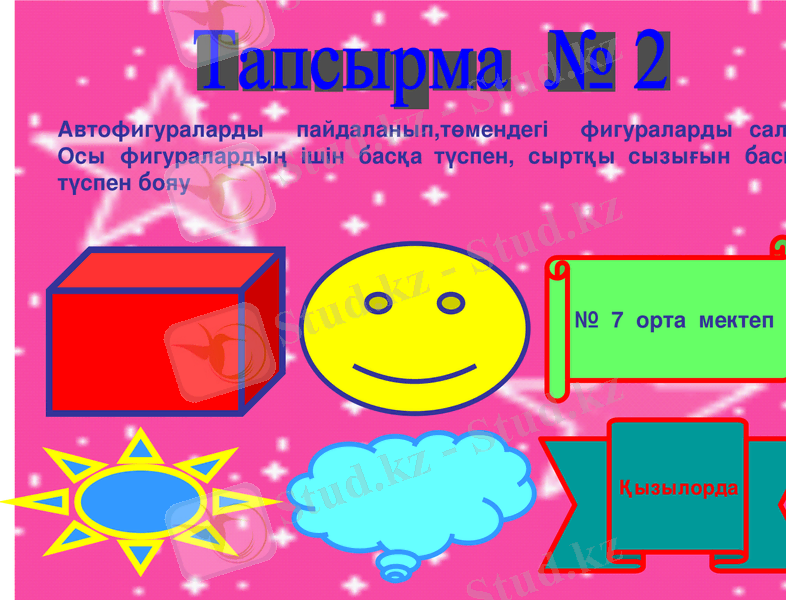 Автофигураларды пайдаланып, төмендегі фигураларды салу. Осы фигуралардың ішін басқа түспен, сыртқы сызығын басқа түспен бояу.