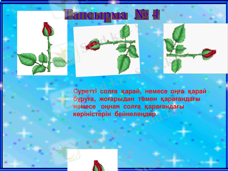 Суретті солға қарай, немесе оңға қарай бұруға, жоғарыдан төмен қарағандағы немесе оңнан солға қарағандаға көріністерін бейнелеңдер.
