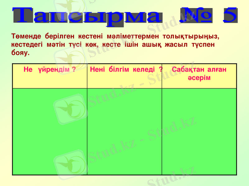 Төменде берілген кестені мәліметтермен толықтырыңыз, кестедегі мәтін түсі көк, кесте ішін ашық жасыл түспен бояу.