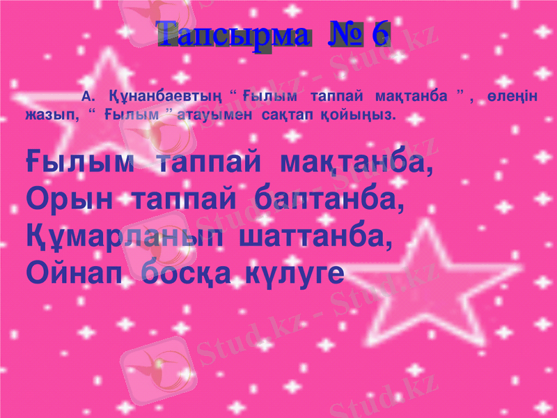 А. Құнанбаевтың « Ғылым таппай мақтанба », өлеңін жазып, « Ғылым » атауымен сақтап қойыңыз.