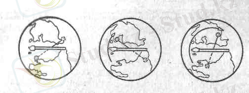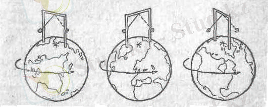 Сурет-3, а - Жер экваторының жазықтығын 24 сағат периодпен айналған спутник. б - бұл жасанды серіктің белгісіз күш арқылы ілінуі экваторда өзгеріссіз көрініп тұр.