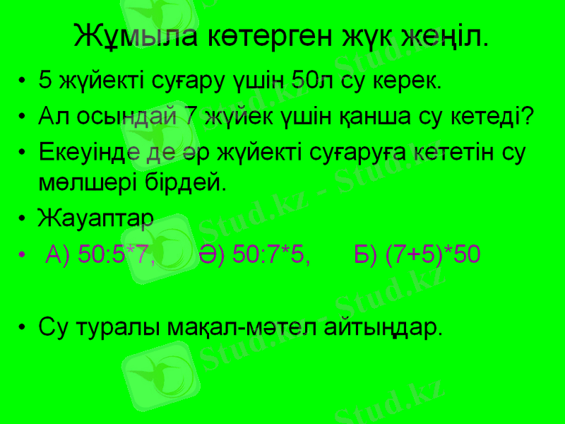 - Енді бүгінгі сабақта айтылған мақалдарды қайталап алып, «Жүк» сөзіне қатысты мақалды мен айтайын, ал сіздер мағынасын ашып беріңіздер. Бүгінгі сабақта осы мақалға сай берілген тапсырманы қалай орындауымыз қажет деп ойлайсыңыздар?