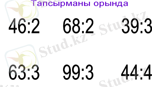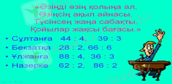 - Келесі бөліміміз «Өзіңді өзің қолыңа ал, өзіңсің ақыл айнасы. Түсінсең жаңа сабақты, қойылар жақсы бағасы. » берілген тапсырмаларды өздерін орындауларын керек. Разрядтық қосылғыштарға жіктеу арқылы екі таңбалы сандарды бір таңбалы санға бөлу тәсілімен мәндерін табыңдар.