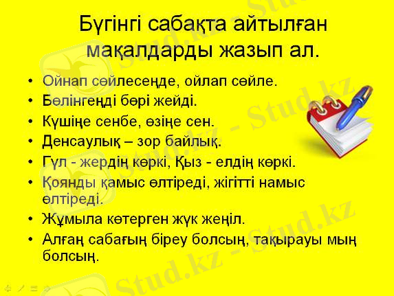 - Балалар, өлеңімізде айтылғандай бүгінгі сабақта біздер тапсырмалармен қатар мақал-мәтелдер айтуға тура келеді. Сондықтан сол тапсырмадағы мен айтқан сөзге сай мақалдар айтуларыңыз керек.
