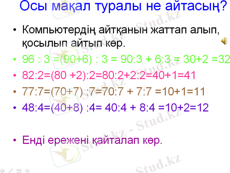 Мақалдың мағынасын ашқызу. Бүгінгі сабаққа қатысты сөзіміз «Бөлу» мына тапсырмалармен жұмыс істеп үйренейік. Компьютерге назар аударып, жаттай отырып, орындалуына мән берулеріңіз сұралады.