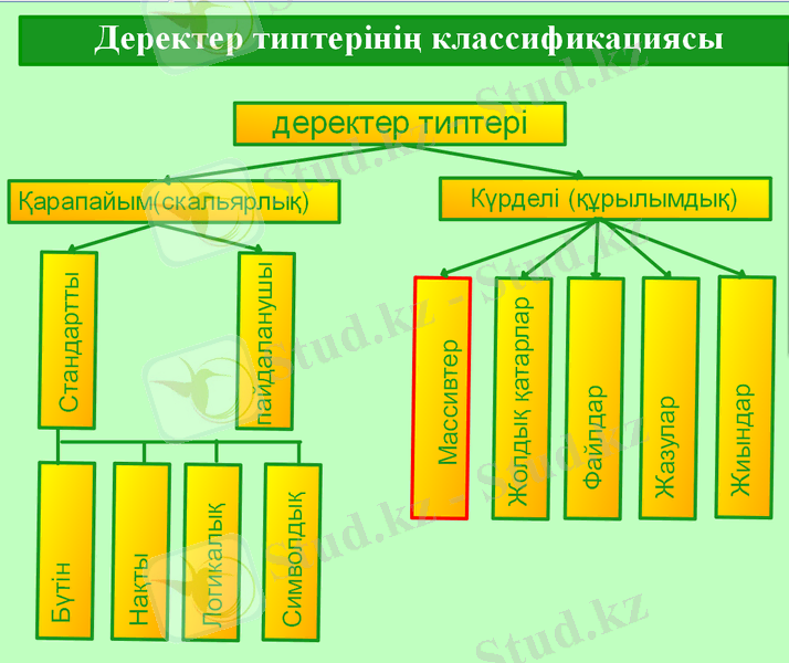 Математикада, экономикада деректердің жинақталған түрлері жиі кездеседі мыс: кесте, фамилиялар тізімі, сандар тізбегі кеңінен қолданылады. Бір типті деректер жиынын өңдеу үшін массив ұғымы енгізіледі.