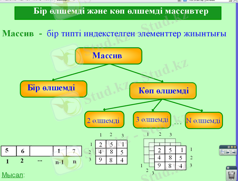 Флипчарттағы мысал сөзіне сілтеме жасау арқылы оқушылар массив ұғымы жайында мәліметті бейне роликтен тыңдай алады.