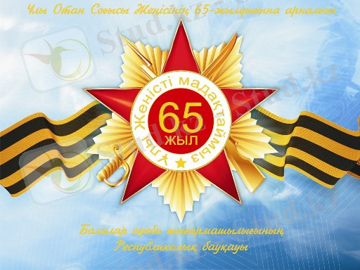 2 - жүргізуші: Дүние жүзі халқы бостандық алды. Халық Отан ұғымың терең сезіне түсті. Қаһарман ерлік пен еңбек жеңіп шықты. Зұлымдық, басқыншылық тізе бүкті. Бірлік, ерлік, халықтар достығы нығая түсті. Биыл Ұлы Жеңіске 65 жылдығын атап өтеміз.