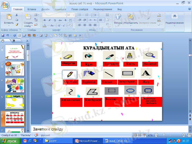 Сабақта қолданылатын көрнекті құралдар : ДК, интерактивті тақта, PowerPoint слайдтары, тапсырмалар.