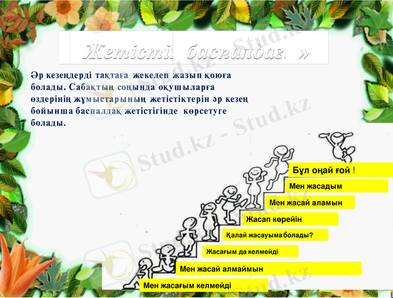 Оқушылар сабақ соңында «Жетістік баспалдағы» арқылы өздерінің жетістіктерін көрсетіп, мұғалімге тапсырады.