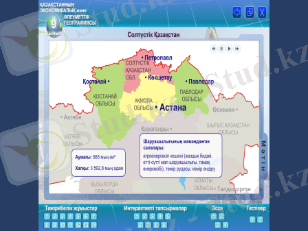 Оқу құралдары: Солтүстік Қазақстанның экономикалық, физикалық картасы, электрондық оқулық.