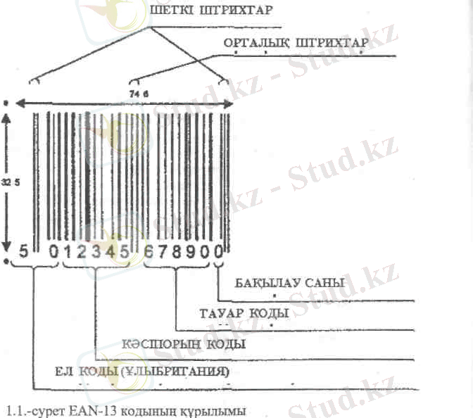 ЕАN-13 кодының құрылымы 1-суретте көрсетілген. Штрих код ені әр түрлі қою түсті (штрих) және ашық (пробел) сызықшалардың алмасып орналасқан. Енінің бірлігі ретінде модуль алынады. Модуль - ең жіңішке штрих немесе пробел (ені-0, 33 мм) . Әрбір цифр екі штрих пен екі пробелге топтастырылған жеті модульмен кодталады. Мысалы, 4 саны 1011100 түрінде келтірілген (жеті модуль, бірақ екі штрих және екі пробел) . Штрихтардың және пробелдардың ені 1-ден 3 модульге дейін.