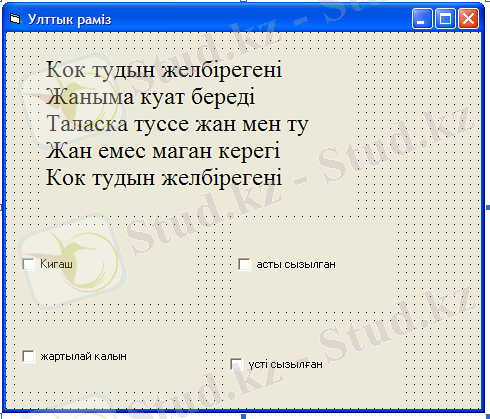 3. Пішінде Label1, Check1, Check2, Check3, Check4 басқару элементтерін орнатыңдар.