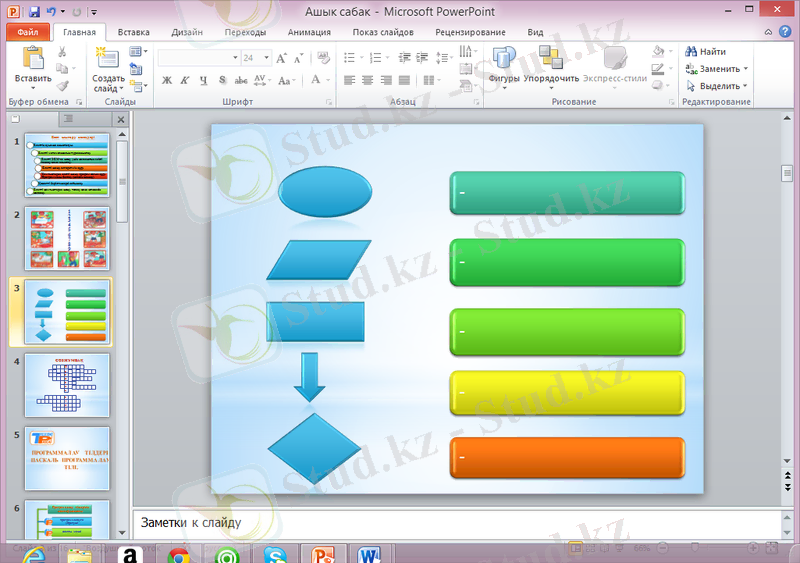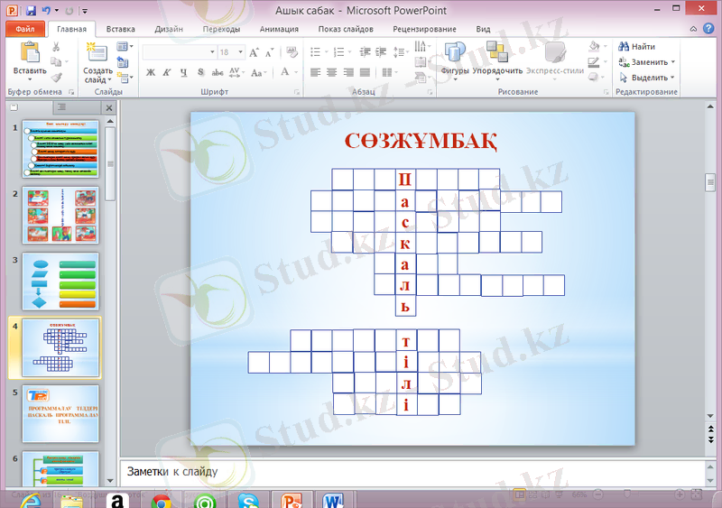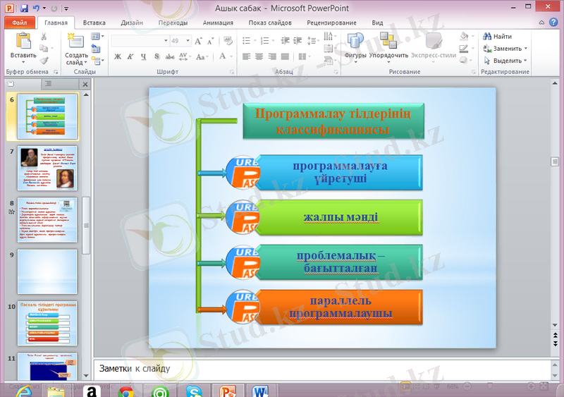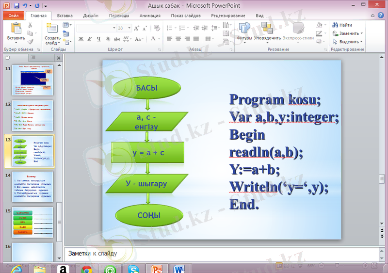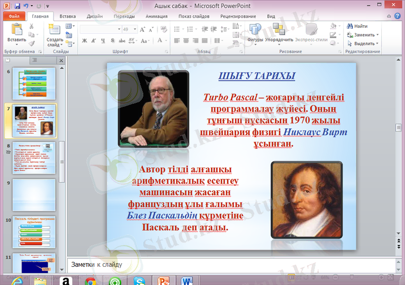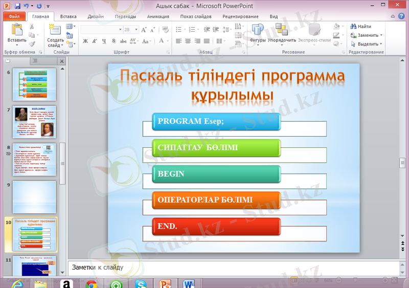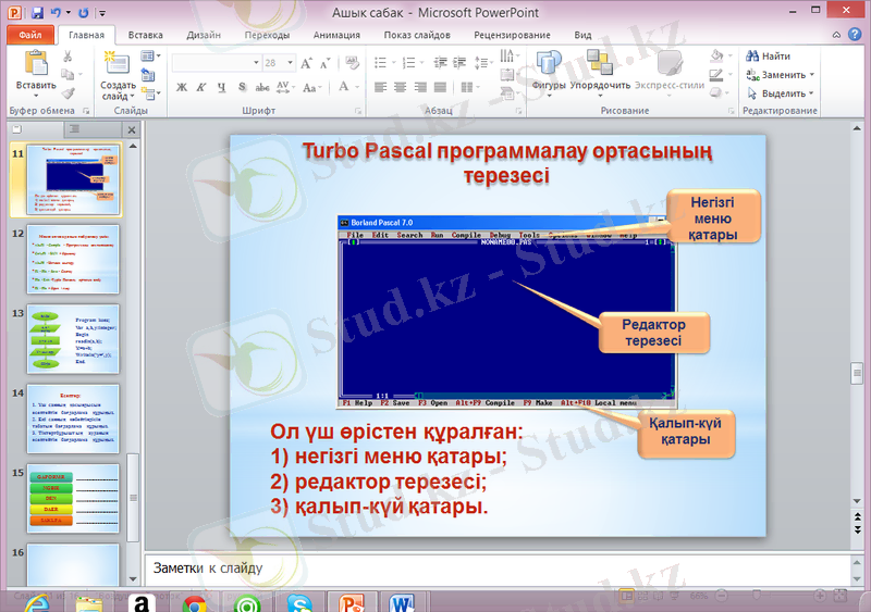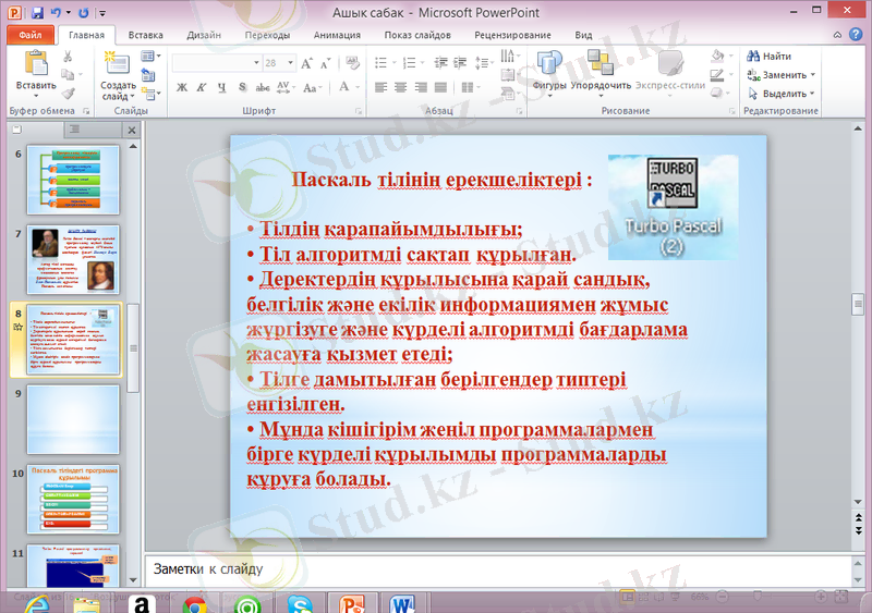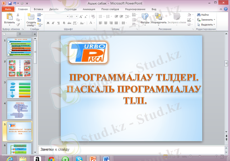 Алдымен интерактивтік тақтада Программалау тілдері, Turbo Pascal программалау тілі туралы слайдтар көрсетіледі, жаңа сабақ түсіндіріледі.