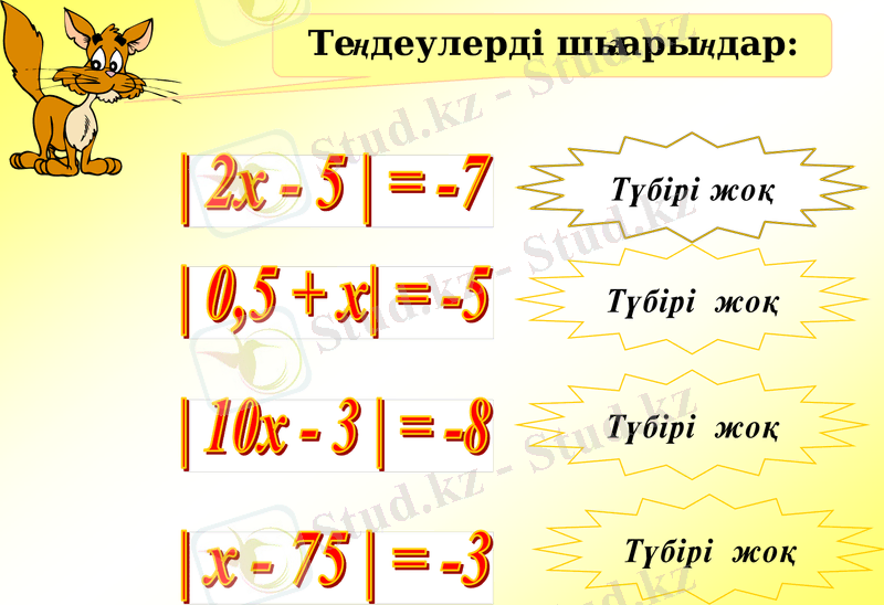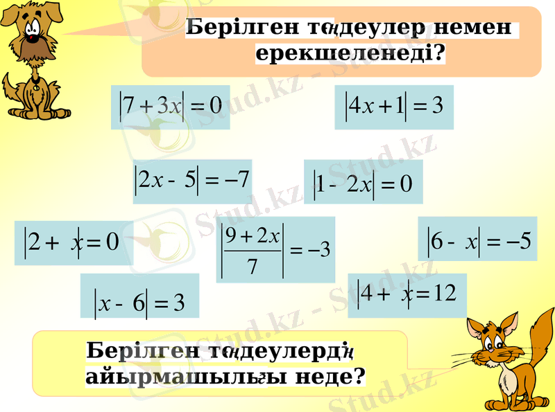 - Білімділік:Оқушылардың қарапайым сызықтық теңдеулерді шығара білу білімдерін және айнымалысы модуль таңбасының ішінде берілген бір айнымалысы бар сызықтық теңдеулерді шешу жолдары мен мәтінді есептерді теңдеу құру арқылы шығара білу білімдерін жалпылау және қорытындылау