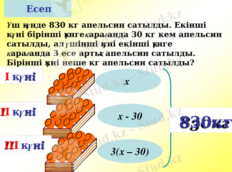 Жауабы: бірінші күні 190 кг апельсин сатылды