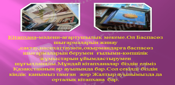 Кітапхана-мәдени-ағартушылық мекеме. Ол Баспасөз шығармаларын жинау, сақтау, насихаттаумен, оқырмандарға баспасөз шығармаларын берумен ғылыми-көпшілік жұмыстарын ұйымдастырумен шұғылданады. Мұндай кітапханалар біздің еліміз Қазақстанның әр ауылында бар. Сол секілді біздің кіндік қанымыз тамған жер Жалтыр ауылымызда да орталық кітапхана бар.
