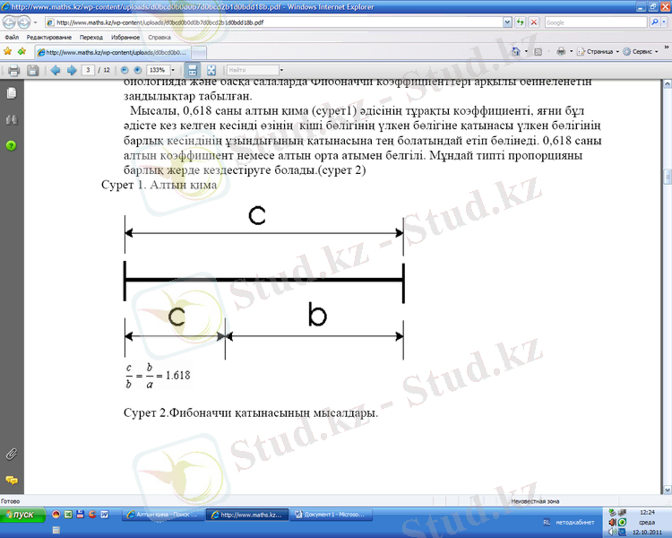 Мысалы, 0, 618 саны алтын қима (сурет1) əдісінің тұрақты коэффициенті, яғни бұл əдісте кез келген кесінді өзінің кіші бөлігінің үлкен бөлігіне қатынасы үлкен бөлігінің барлық кесіндінің ұзындығының қатынасына тең болатындай етіп бөлінеді. 0, 618 саны алтын коэффициент немесе алтын орта атымен белгілі. Мұндай типті пропорцияны барлық жерде кездестіруге болады.