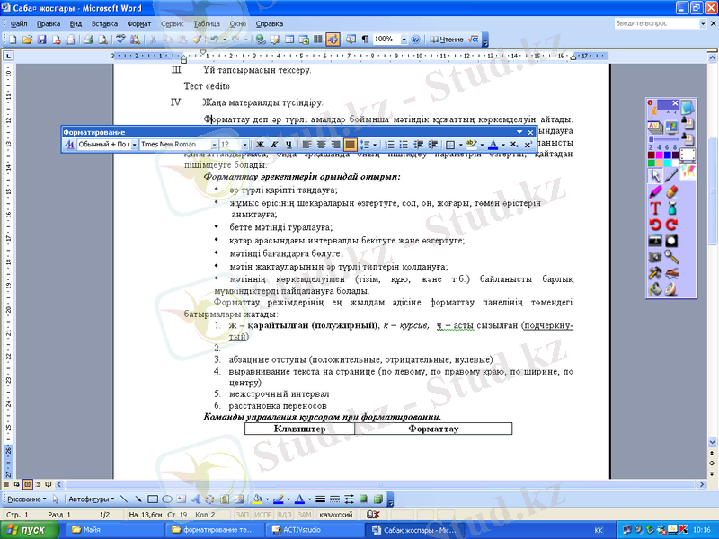 1. Оқушыларды мәтінді форматтаудың негізгі әдістерімен таныстыру.
