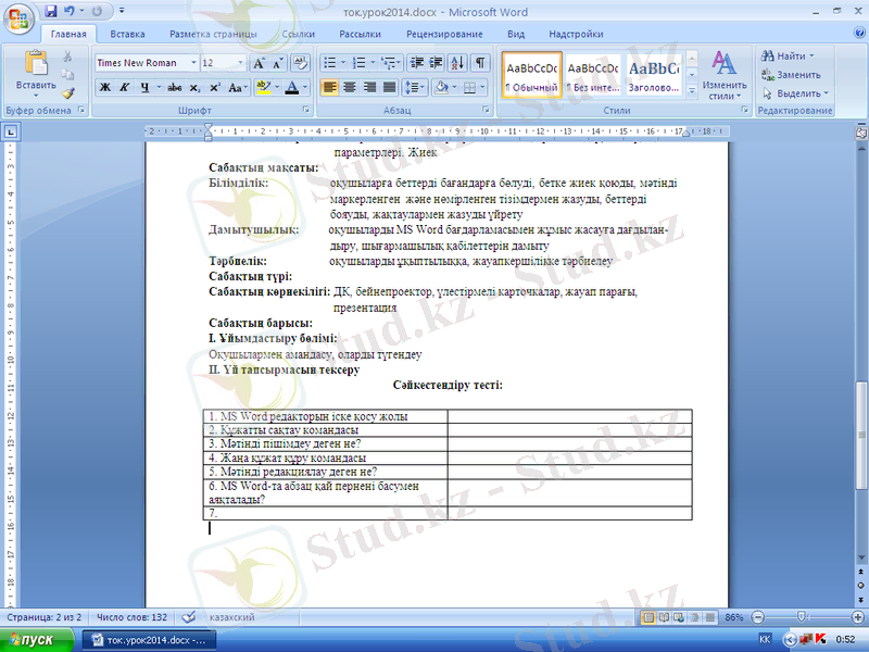 Сабақтың тақырыбы: Кестелер. Кестелер құру. Кестелерді редакциялау. Кесте ішіндегілерін енгізу және пішімдеу.