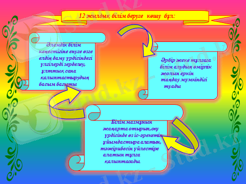 Қоғамның дамып өркендеуіне байланысты қазіргі таңда білім саласында ең өзекті мәселенің бірі әлемдік білім кеңістігіне жол ашатын 12 жылдық білім беру жүйесіне көшу болып отыр. Білім берудің бұл моделі 80% астам елдерінде қолданылады, себебі білім беру қызметіне жаңаша қарау, жеткен табыстарға сын көзбен саралай отырып бағалау, оқу үрдісін ұйымдастыруда тиімді әдіс-тәсілдерін, нысандарын іздестіру талап етілуде. Қазіргі заманның өзекті мәселелерінің бірі - өзгермелі әлеуметтік және экономикалық жағдайда өмір сүруге ғана емес, айналасындағы шынайы өмірге белсенді қатынасын байқатып, оны жақсартуға ықпал ете алатын, бәсекеге қабілетті жеке тұлғаны қалыптастыру болып табылады. Осы мақсат аясында бүгінде мектеп әрбір балаға жеке адам ретінде қарап, құзыретті, ой-өрісі кең, еркін әрекет жасайтын қабілеті бар, батыл пікір айта алатын, креативті, белсенді, жауапкершілігі жоғары, сауатты, танымдық әрекетке қызығушылығы басым тұлға ретінде тәрбиелеуге, ал педагог баланың бойынан өзіне тән нәрселерді тауып, оның құзыреттілігінің дамытылуына көмек беруге бет бұрғандығы бәрімізге мәлім. Осы негізде 12 жылдық білімге көшу бұл: