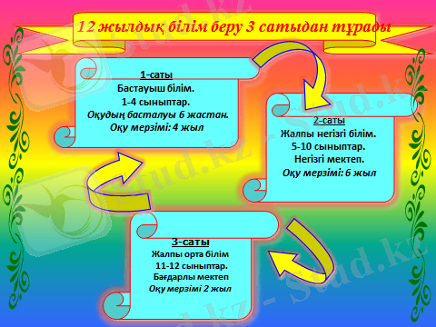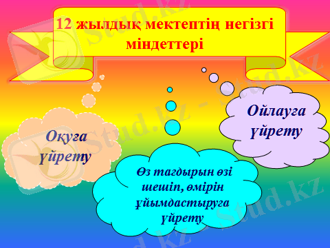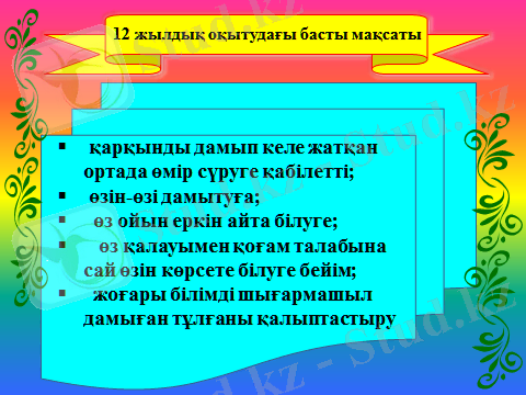 - 12 жылдық мектептегі білім беру мақсатын, міндеттерін, құрылымын, мазмұнын және оқу-тәрбие процесін ұйымдастырудың ерекшеліктерін ашып көрсету;