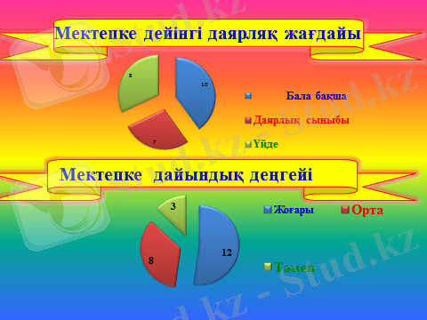 Дамытушылық тренинг жаттығулары оқушылардың зейінін арттыру, сөздік қорын молайту, қол-саусақ моторикасының дамып жетілдіру мақсатында жүрді. Педагогикалық-психологиялық жұмыстар оқу жылы басында біршеше рет өткізілді, қорытындысы бақылаушы сынып қорытындысымен салыстырылды. Оқу жылының соңында барлық жүргізілген диагностика нәтижесі алты және жеті жасар оқушы арасында үлкен айырмашылық байқалмайтынын, баланы алты жастан мектепке қабылдауға болатынын көрсетті. Республикалық ғылыми орталықтан жіберілген әдістемелік құжаттармен танысып, берілген тапсырмаларды дер кезінде ұйымдастырып отырдық. Мектебімізде ұйымдастыру жұмысы кезінде әр отбасымен танысып, ана-аналардан сауалнамалар алынып, баланың психо-физиологиялық дамуы анықталды. 6 жасар балаларға арналған кабинет, ойын кабинеттері ұйымдастарылды.