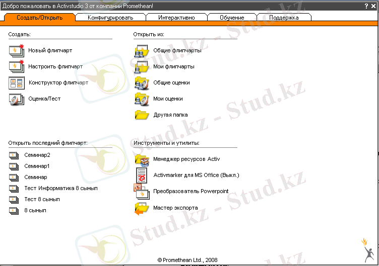 Бұл стандартты терезе. Командалар орналасуы Activstudio бағдарламасы орнатылған компьютерлерді осы үлгіде болады. Тек Открыть последний флипчарт: қатарындағы файлдар тізімі сіздің компьютеріңізде өзгеше болуы мүмкін.